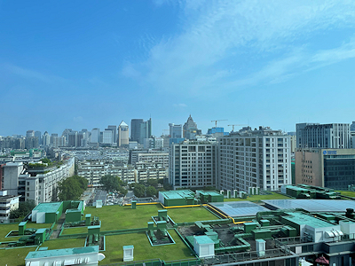 隣接する商業施設の屋上ビューです 緑化されているので案外悪くなかったです昨晩は少し雨が降りましたが