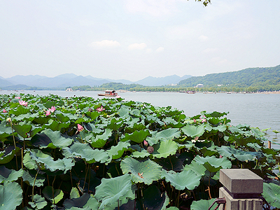 西湖では四季それぞれ美しい景色が楽しめるのだそう 夏は蓮の花です |