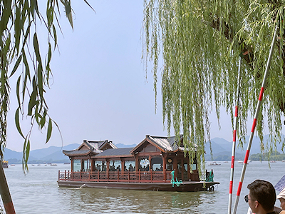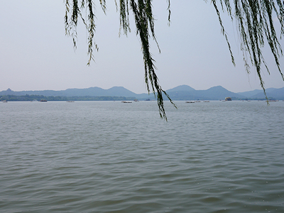 対岸の山々は稜線が美しく 湿度が高いからかモヤがかかっていて 水墨画のように見えました 湖畔には多くの柳の木が植えられていました 西湖十景には「柳浪聞鶯」として