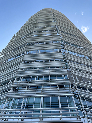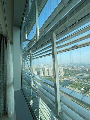 ホテルの入った建物を見上げる この建物はアメリカの設計事務所SOMの設計河南省にある中国最古のレンガ造の塔、嵩岳寺塔をイメージしてデザインされているのだそう。 |