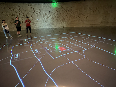 | 正面のスクリーンと下の都市模型に映像が映されます。 |