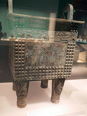 | 反射してしまっていますが方鼎と呼ばれる青銅器。 箱型の器に美しい装飾が施された4本の足がついています(多分これは複製品です)。