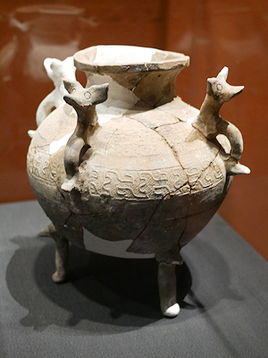 | 三本の足がついた鼎と呼ばれる土器 先程の鄭州商都遺跡博物院には方鼎という箱型の器がありましたがこちらは円形。 鍋の用途で使われたもの。 ひっかけたり運んだりするための耳(取っ手のようなもの)がついているのだけれど、それが動物の形をしています。