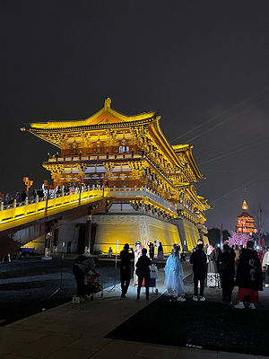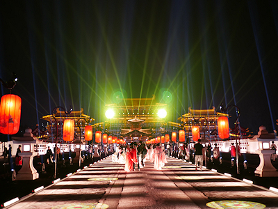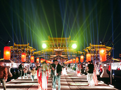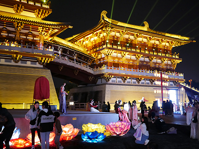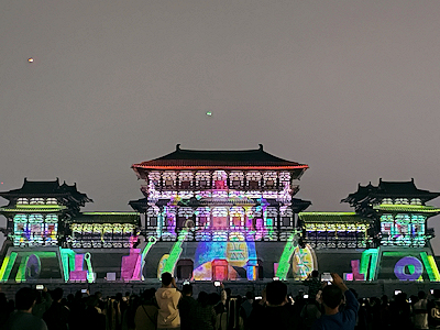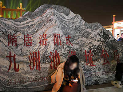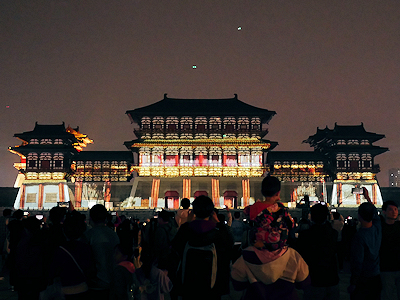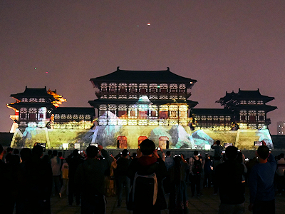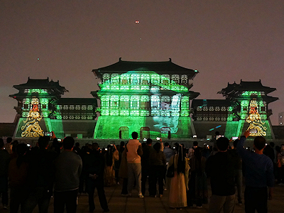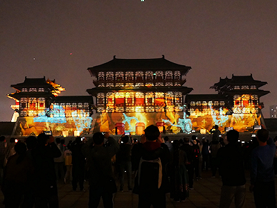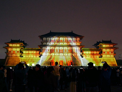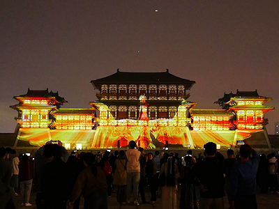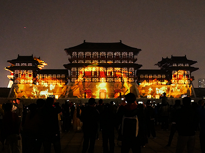河南省洛陽の隋唐洛陽城国家遺跡公園内にある応天門遺跡博物館前で開催されたプロジェクションマッピングを見学する。