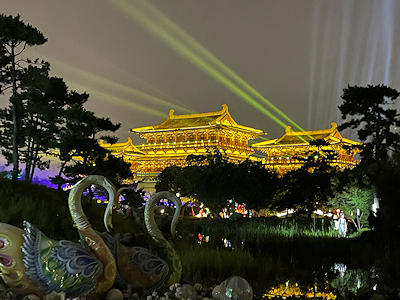 先程見学した応天門遺跡博物館や明堂・天堂のライトアップも美しかったけれど、この九洲池はさらにパワーアップ。