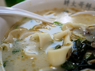 中国の幅広麺というと漢字の画数が多いことでも有名なビャンビャン麺があるけれど、ビャンビャン麺のオーソドックスな食べ方は辛いタレをかけてまぜて食べるのだけれど、烩面(フイ麺)は辛くないスープなのでフイ麺のほうが私の好みでした。
