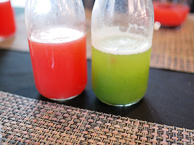 左はスイカジュースですでに2本目、右の緑のジュースは体に良さそうだと思って、あるとついつい取ってしまう系のジュース |
