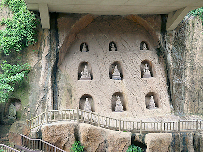 | 地上に出ました 大きなドーム屋根の下にある 壁に彫られた仏像 |