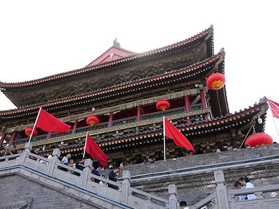 西安の鐘楼は明の時代、14世紀に建てられ1582年に現在の場所に移されたもの。 城壁内のほぼ中心に建ち高さは36メートルある。 ここから東西南北に大きな通りが伸び城壁の門に通じている。