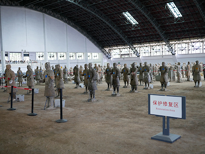 一号坑の奥の方のエリアでは兵馬俑の修復や調査、記録が行われていて、その様子を見ることが出来る。