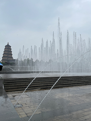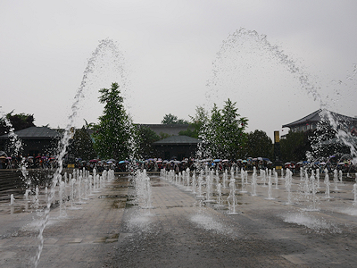 休憩している間に雨が降り出してしまったのだけれど、先程塔の上から見えていた大雁塔の近くの広場で開催される噴水ショーを見に行く。