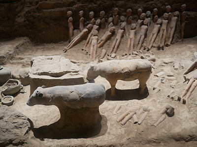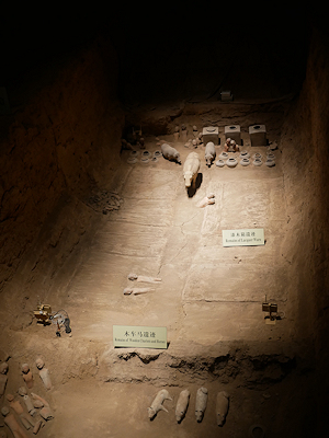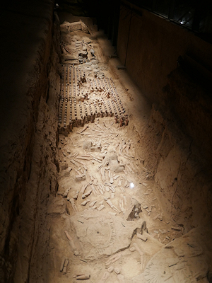 漢陽陵の外蔵坑からはたくさんの兵士俑などが出土している。 上の写真の模型で右手前の赤く囲われている部分が帝陵外蔵坑遺跡保護展示庁となっていて、発掘調査された10の坑の上にガラスが貼られ保存展示されている。