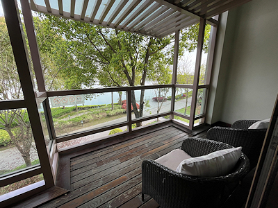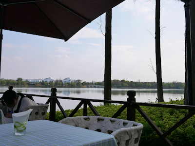 この時間帯は朱家角の中心地は混んでいそうなので、ホテル内のカフェでお茶をしてから観光に出掛けることにし、私達の部屋のバルコニーからも見える湖畔に建つ別棟のカフェに向かった。