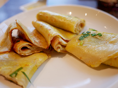生地と卵をクレープのように薄く焼いて 甜麺醤を塗って巻いたもの 中国の定番の屋台料理です |