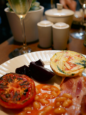 | 別の日はこんな卵料理を取ってみました キッシュのようなものです 隣の黒く見えるものはビーツ |