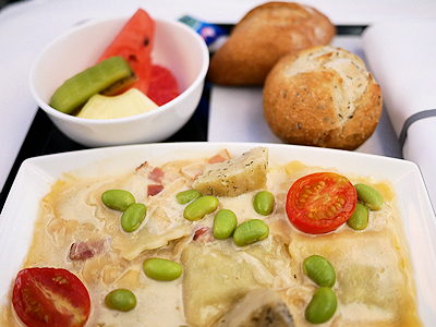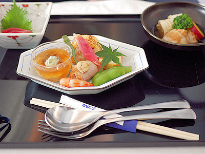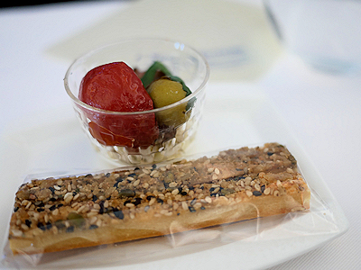 最初の機内食のアミューズ 手前のグリッシーニのようなものは、前回の旅行の際も、そのかなり前に利用した際にも頂きましたが、定番で出てくるものなんですね。上にかかっているものが毎回微妙に違う気がしますが美味しくて大好きです。 |