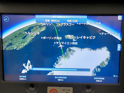 往路は北回りと呼ばれる経路でした。 ということで、ほぼアラスカ上空を通るんですね。