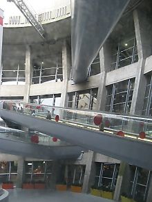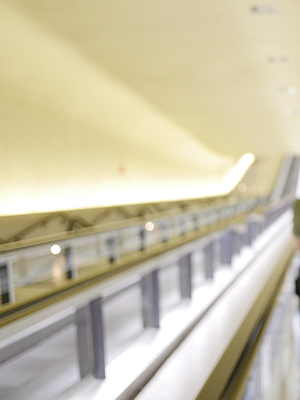 遠い昔に撮った写真です もう随分長い間この吹抜けは見ていないので、第1ターミナル到着後に通る長くて窓もない下がって上がる動く歩道(スロープ状のエスカレーター)に乗るだけでも「着いたー!」とテンションが上がるようになりました。 ピントが全く合っていませんが そのスロープ状のエスカレーター↓ |