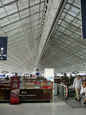 前回シャトルバスに乗った際は、ターミナル1からターミナル2Aへ行くシャトルバスとターミナル2を循環するシャトルバスに分かれていて、シャトルバスも乗り継ぎをしなければいけなかったのだけれど、今回は「ターミナル1と2A~Gを巡回するバス」が復活していたので、乗り継ぎなしで次のターミナル2Fまで移動できた。 シャトルバスから見えたターミナル1の建物にはこの時期開催中だったパリオリンピックの横断幕のようなものが付いていた。せっかくなので写真を撮りたかったのだけれどタイミングが合わず撮れず(ターミナル1の廻りをぐるりと廻ったので2回くらい見えたのだけれど…残念)第2ターミナルに到着した。