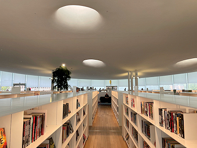 3階は波打つような天井に覆われた空間。 ぐるりと窓があり本棚も低いタイプでフロア全体が見渡せて、とても明るい空間でした。 |