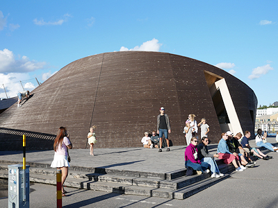 今回は修復工事も終わりきれいになっていましたが、閉館時間になっていたので中には入れませんでした。その手前の建物はヘルシンキ・ビエンナーレの際につくられたパビリオンのようです。