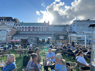 パビリオンを見ている時に、なんだか賑やかな声が聞こえてくるなと思っていたのだけれど、パビリオンの先のオールドマーケットホールの海側に屋外のカフェバーのようなものがあり、そこでお客さんたちがカラオケを歌っていたのだ。