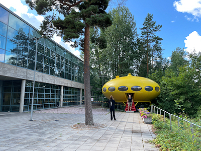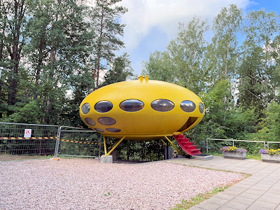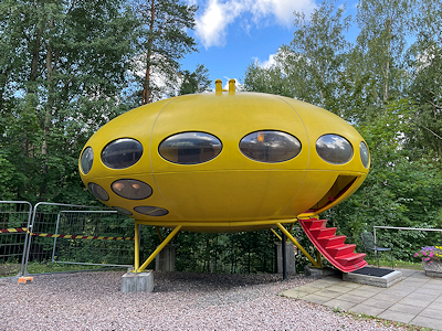 これは「フトゥロ(Futuro)」という名のプラスチック製のプレハブ住宅。 フィンランドの建築家マッティ・スーロネン(Matti