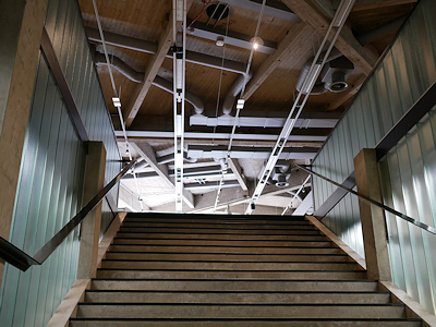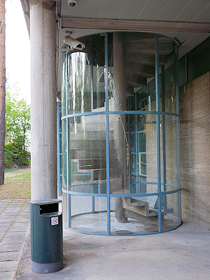 フトゥロ(Futuro)が置かれた庭にあった階段 印刷工場時代の階段をガラスで覆っているようですが出入口はないように見えます。