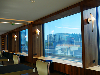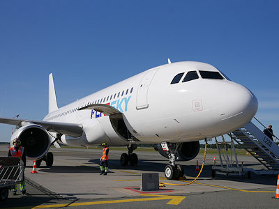 | 反射がきつすぎますが、お隣に停まっていた飛行機は、エア・バルティックのゲートで使われていたのと同じ黄緑色がアクセントカラーになっています |