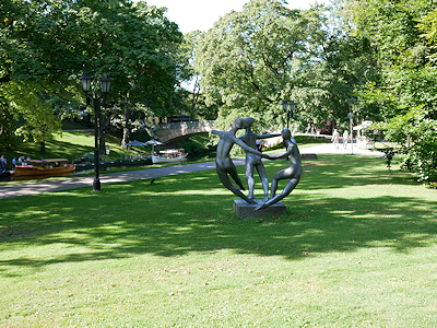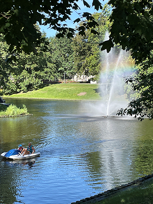 この公園は、かつて町を守るためのお堀として造られた運河沿いに整備されたものです 運河では噴水があがっていました |