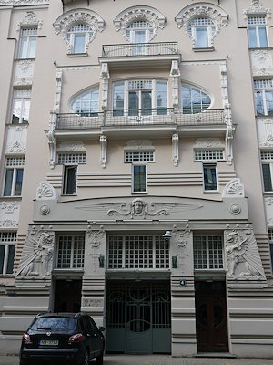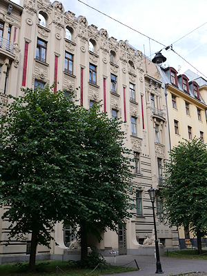 1908年に建てられたもの 設計したのはラトビアの建築家Eizens Laube(エイジェンス・ラウベ)、先ほど内部を見学した建物を設計した建築家の一人です