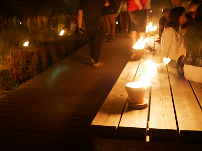 食事をしているうちにイベント開始の22時を過ぎていたので、来た道を戻っていくと、公園内に置かれていたオブジェなどに火が灯っていた。