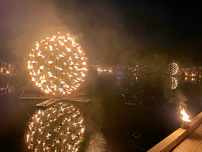 火のインスタレーションは様々なタイプがあり公園内の水面に反射しとても美しかったし、屋台での「ドーゾ空耳体験」も楽しかった。
