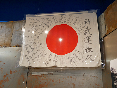 | 出征の際に贈られる寄せ書きのある日本国旗が展示されていました