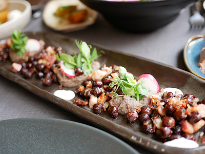 これはラトビア名物のグレイピーズ(Grey peas)という灰色のエンドウ豆の料理 |