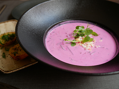 こちらはビーツの冷製スープ ラトビアやリトアニアなどこの地域の夏の定番スープなのだそうビーツのスープというと真っ赤なボルシチが有名ですが、こちらはヨーグルトのようなもの(ケフィアなど)が入っていてピンク色です ラトビア語ではAukstā zupaという名前のようですが、英語メニューにはピンクスープと表記されていました
