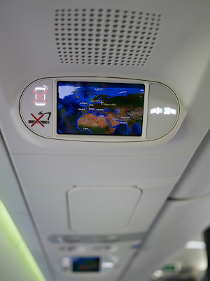 座席前の個人用モニターはなかったけれど、天井についているモニターは携帯用ゲーム機くらいのサイズで、よくあるもう少し大きなサイズのモニターより多くついていました |