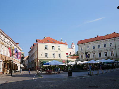 旧市街の小さな広場 カフェやレストランのテーブル席がたくさん並んでいます |