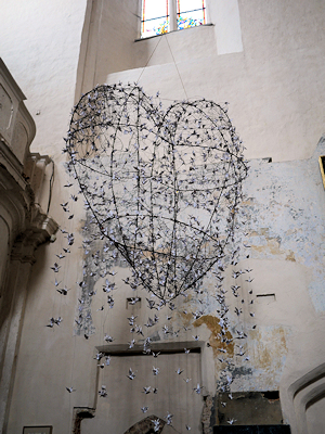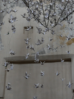 ハート型のオブジェ 吊るされているのは白い折り鶴 |