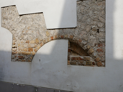 後年の外壁の塗装により塗りこめられてしまっていたかつての外壁をあえて見せるデザイン |