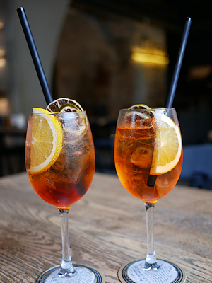 まずは飲み物 この旅の定番アペロール・スプリッツァーオシャレレストランだったようで、オレンジだけでなくドライフルーツ(黒いライム?)も添えられていました 暑かったので一気に飲み干してしまい、2杯目は白ワインのグラスを頼みました |
