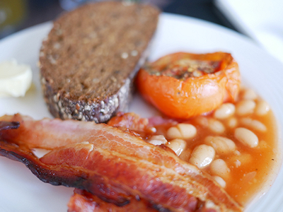 後は豆のトマト煮込み…しかしこの豆ってうまく盛り付けできなくて他の食材にしみてしまいますよね?
