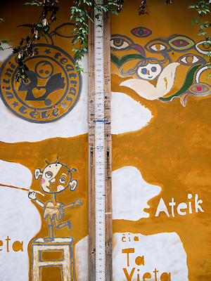その途中、路地の塀に描かれたアート?と身長計