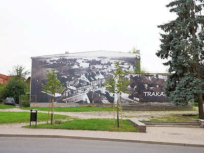 | 建物の壁面に描かれたトラカイの街並み |
