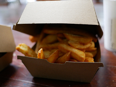 このまま町まで戻って昼食にするか迷ったのだけれど、園内の出口に近い場所に食べ物を売っている売店があったので、そこでハンバーガーのセットを買って外のベンチで食べることにした。