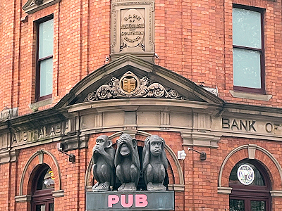 PUBという看板の上には 見ざる聞かざる言わざる その名も「3 wise monkeys」というパブのようです |