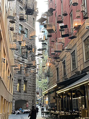たくさんの鳥かごが吊るされた通り アート作品のようです |