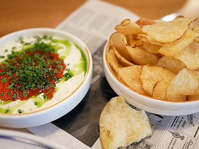 料理は三種類頼みました これはサワークリームの上にイクラのようなもの(トラウトロウ)がのった料理、チップス付き
