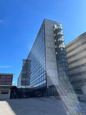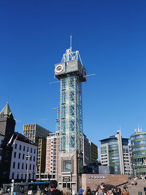 | こちらはオスロ中央駅前に建つガラス貼りの階段室を持つ時計塔です 下にはRuterというオスロ近郊の公共交通機関のカスタマーセンターの入口がありました |