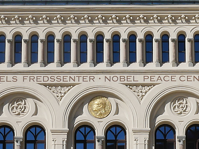 | 公園に来る前に見学したノーベル平和センターの入口に設置されていたノーベル平和賞のメダルをモチーフにした飾り |